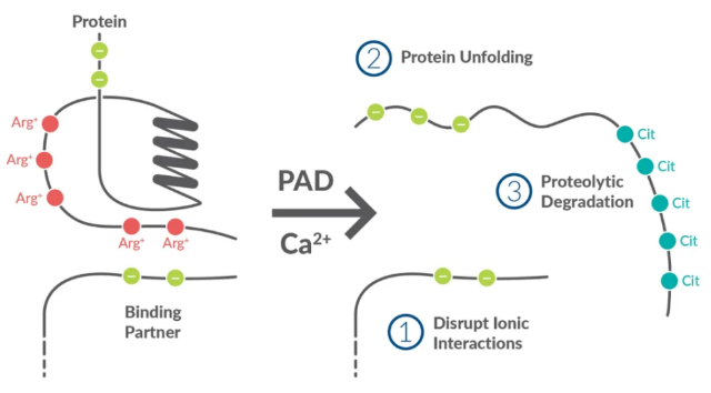 ①作用机制:通过瓜氨酸脱亚胺酶(PADS)家族将精氨酸残基酶促转化为瓜氨酸。这种修饰主要是由PAD家族介导的,会导致正电荷的丢失,氢键能力和染色质去浓缩的降低。在PAD家族中,PAD4非常重要,因为它可以使组蛋白瓜氨酸化,减少组蛋白与DNA之间的相互作用,并最终促进NETSS的形成。